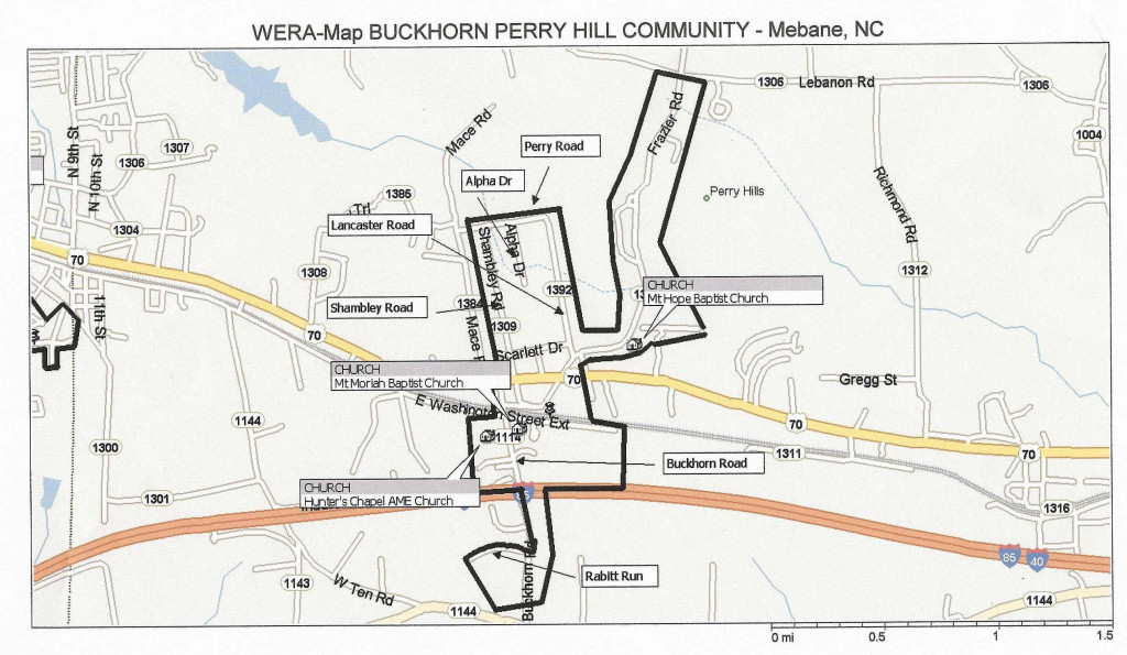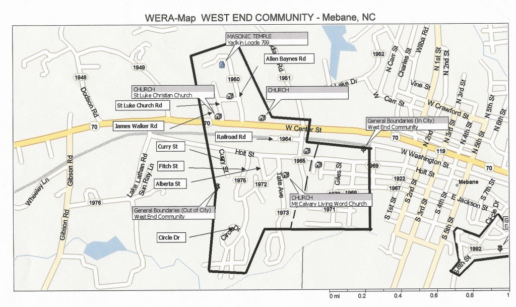 Founded in 1994 by Omega and Brenda Wilson, the West End Revitalization Association, Inc. is Alamance County’s first, and only, grassroots “Right to Basic Amenities” organization. WERA provides service to residents, homeowners, and landowners of five predominantly Black communities in, and around, Mebane. These communities, which are located just beyond the Mebane city limits, were settled by former slaves shortly after the Civil War and are 85% to 95% African-American.